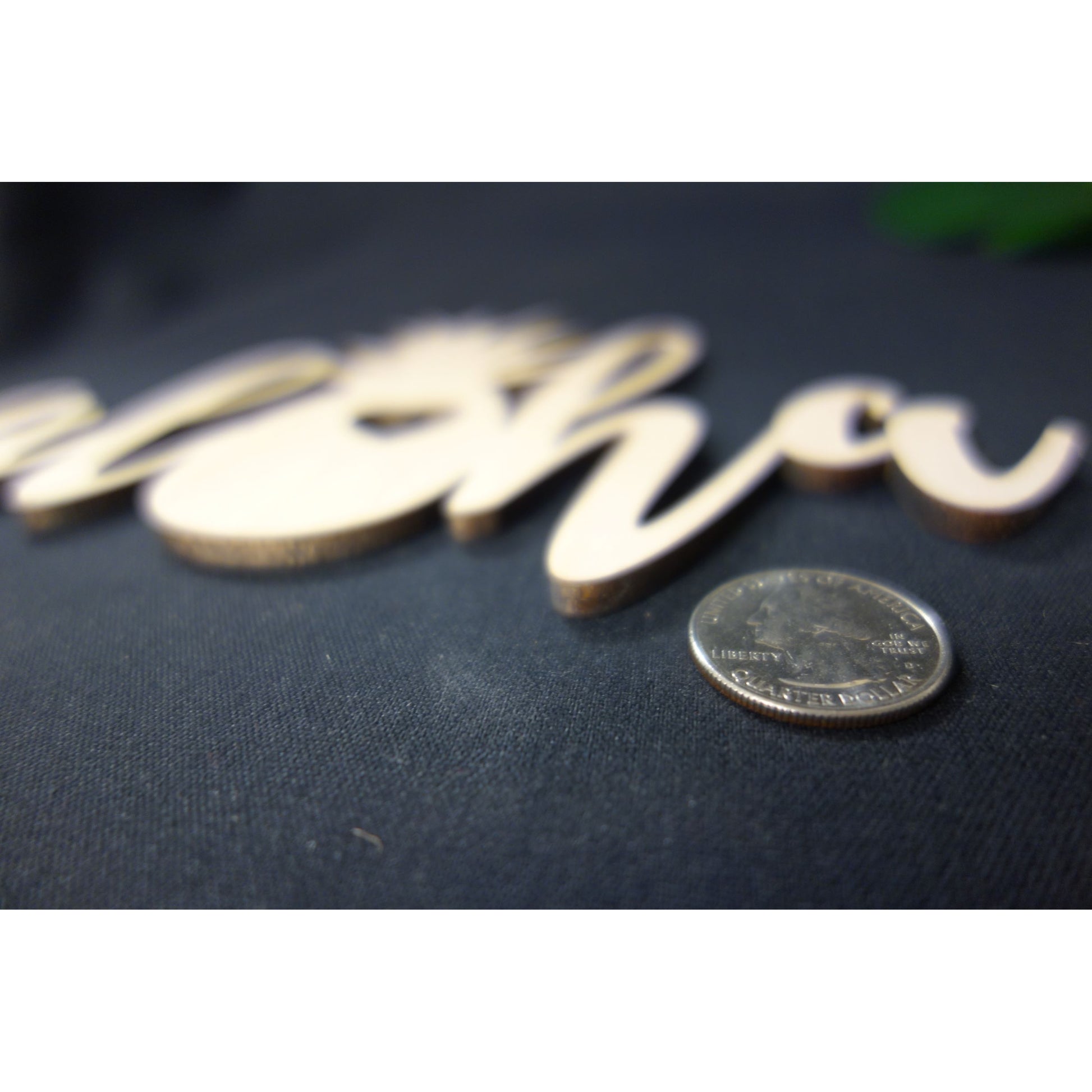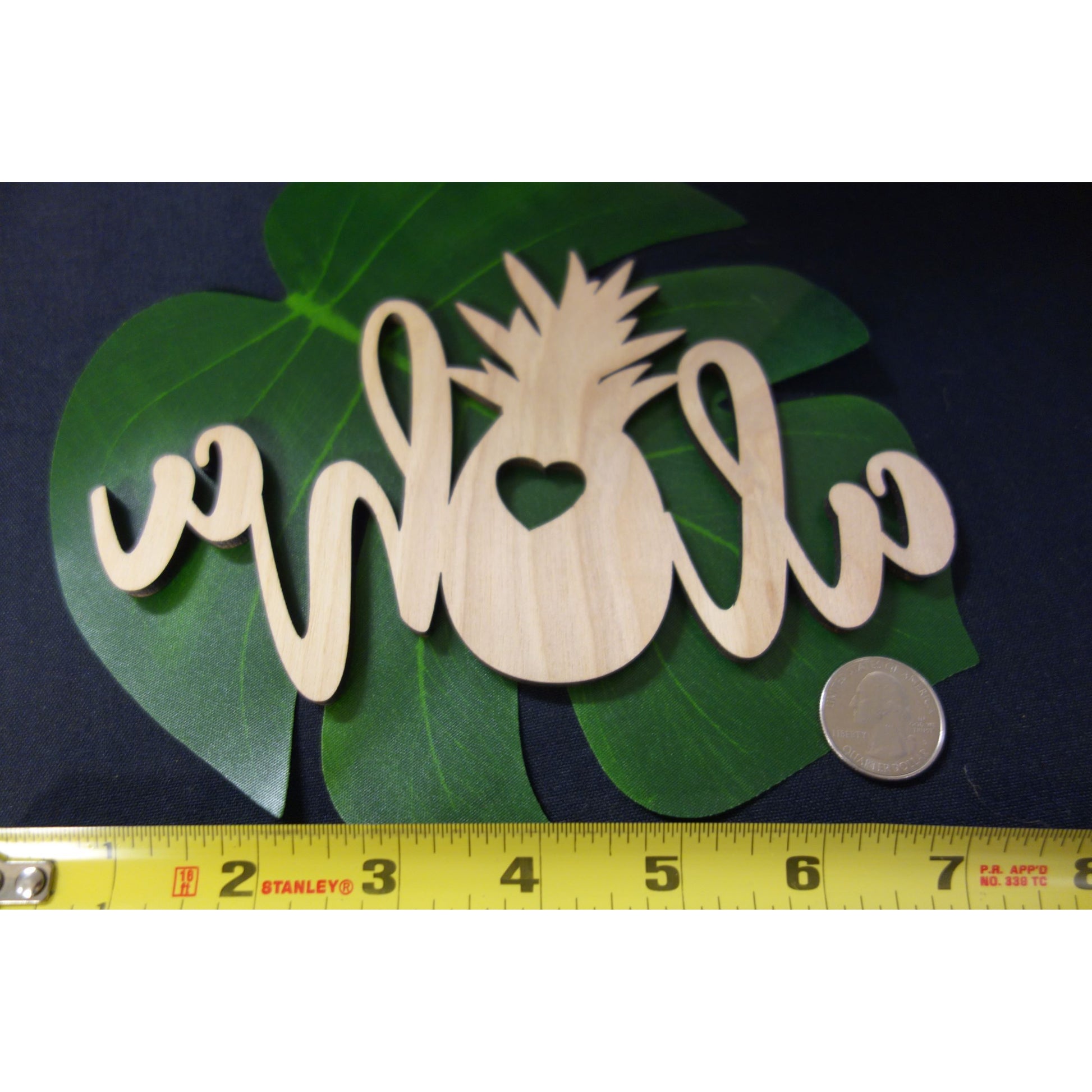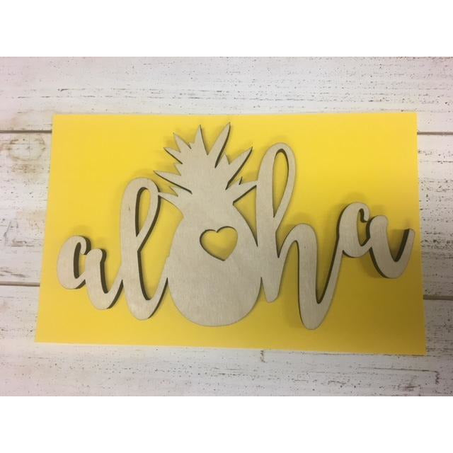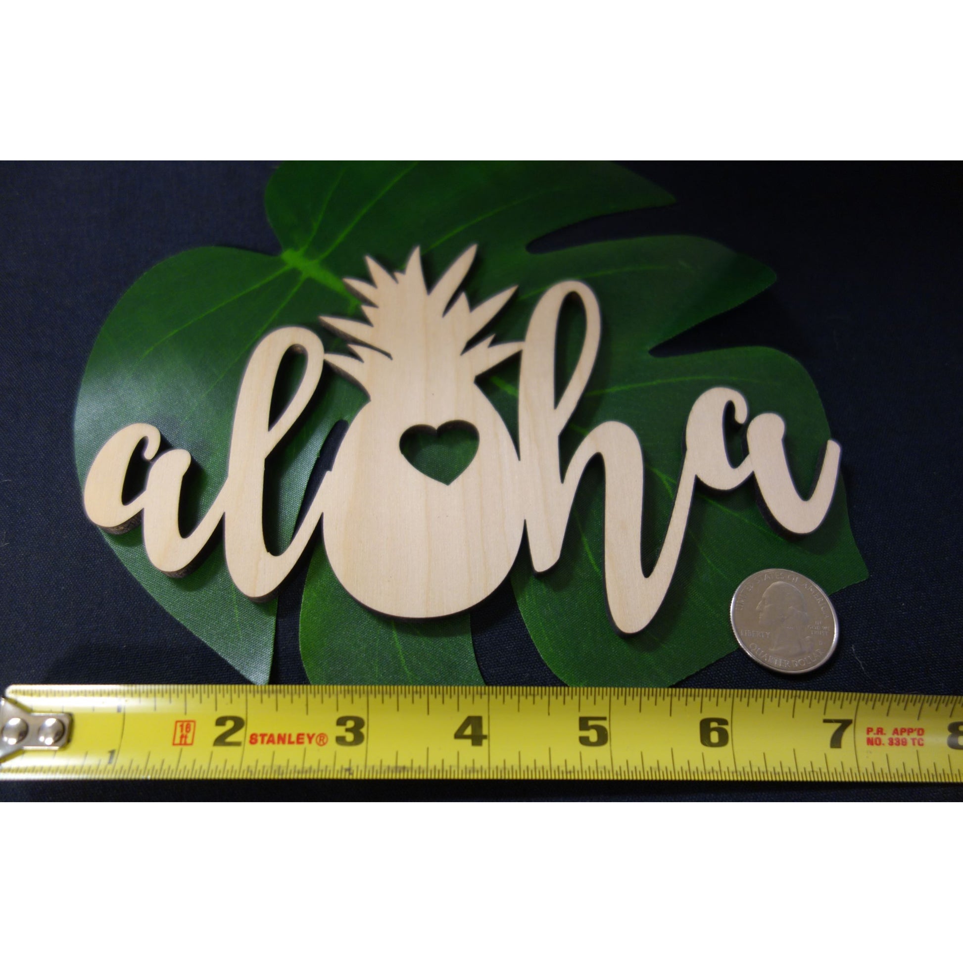 Laser cut wood sign featuring the word ALOHA with a Pineapple in place of the 'o' in aloha, with small heart inside of pineapple.