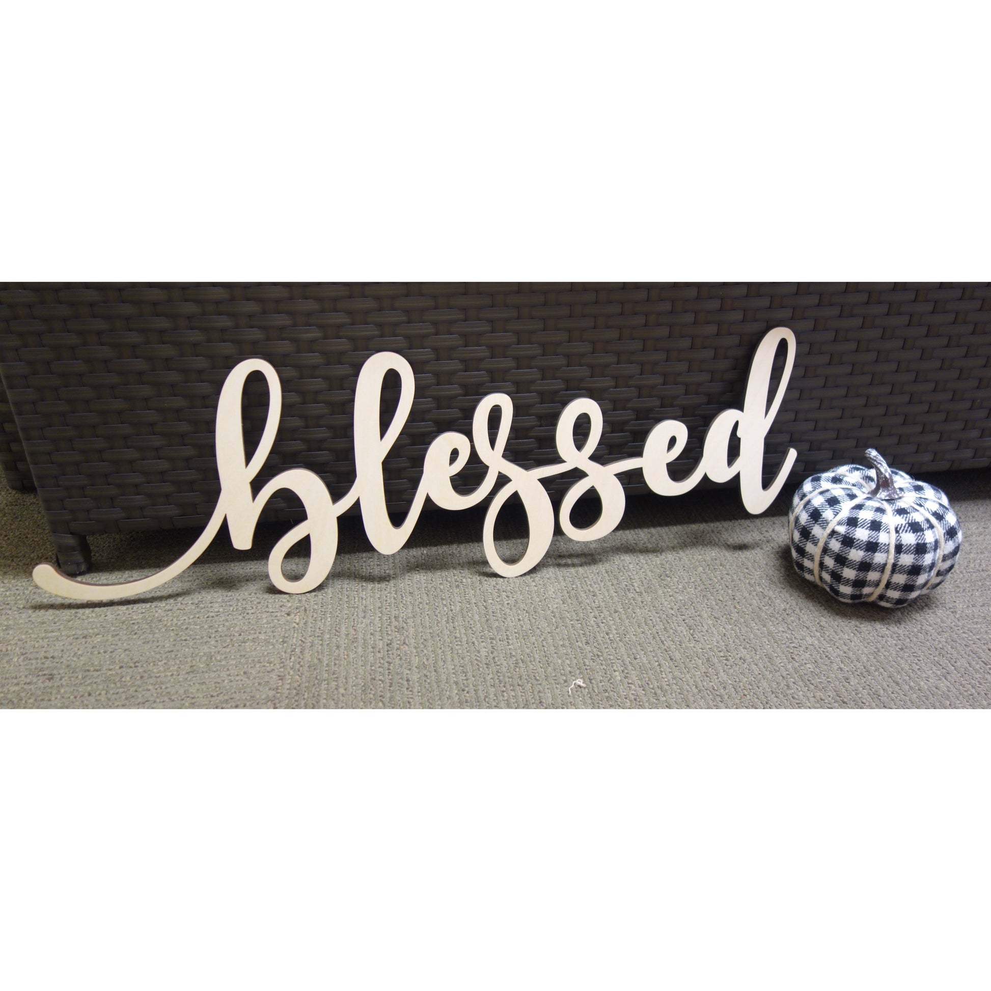 Laser cut wood sign featuring the word "blessed" in freestyle cursive.