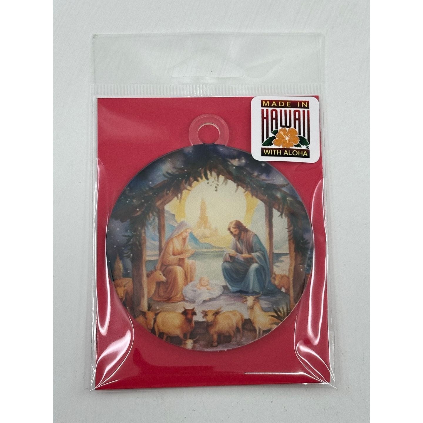 This beautifully designed acrylic ornament features a peaceful nativity scene, perfect for adding a touch of serenity and devotion to your Christmas tree. Proudly made in Hawaii, this ornament combines timeless holiday tradition with the tropical warmth of the islands.