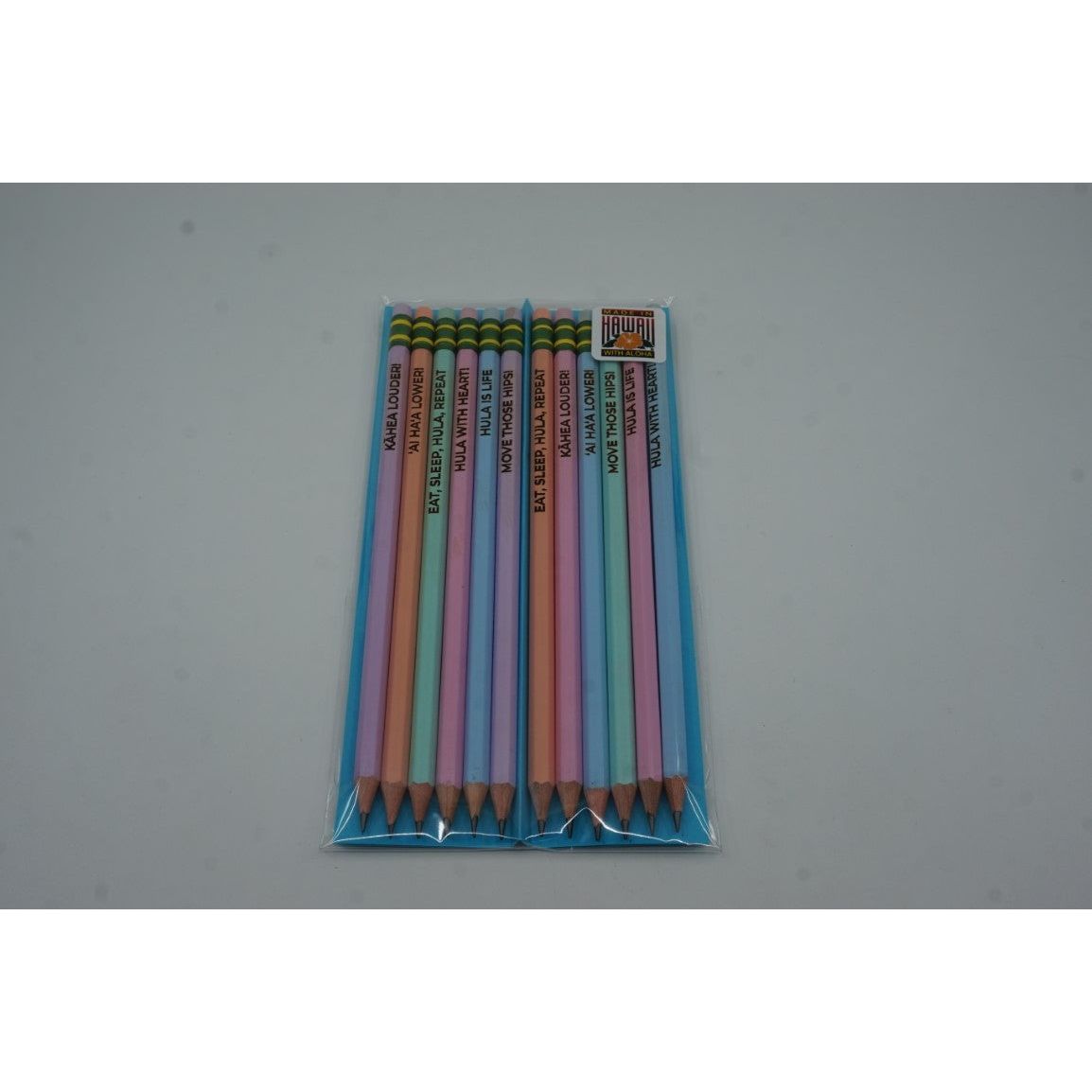 This charming set of colorful pencils, made in Hawaii, features an assortment of pastel hues and playful, inspirational phrases that embody the vibrant spirit of the islands.