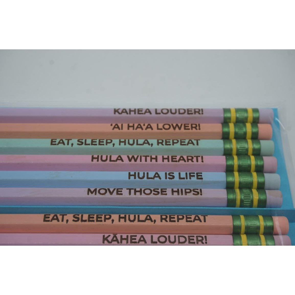 Each pencil is inscribed with encouraging words like "Kāhea Louder," "'Ai Haʻa Lower," "Eat, Sleep, Hula, Repeat," "Hula with Heart," "Move Those Hips," and "Hula is Life," capturing the essence of Hawaiian culture and the joy of hula dancing.