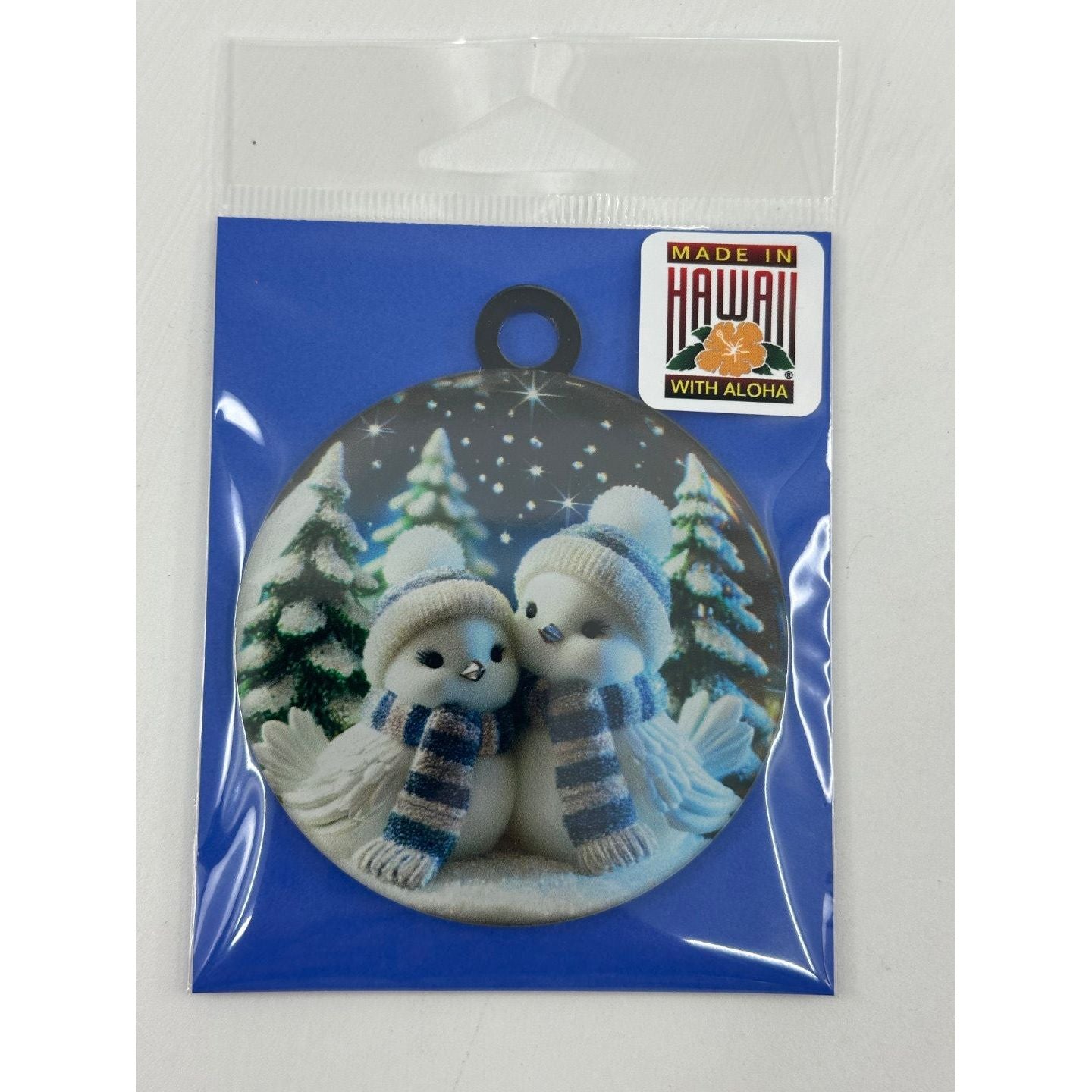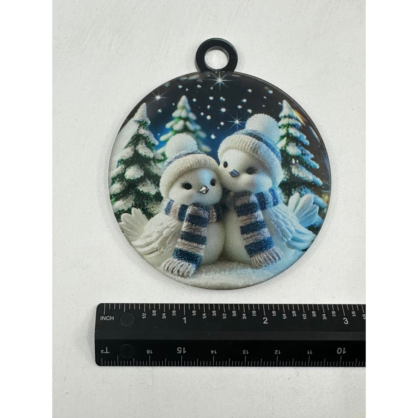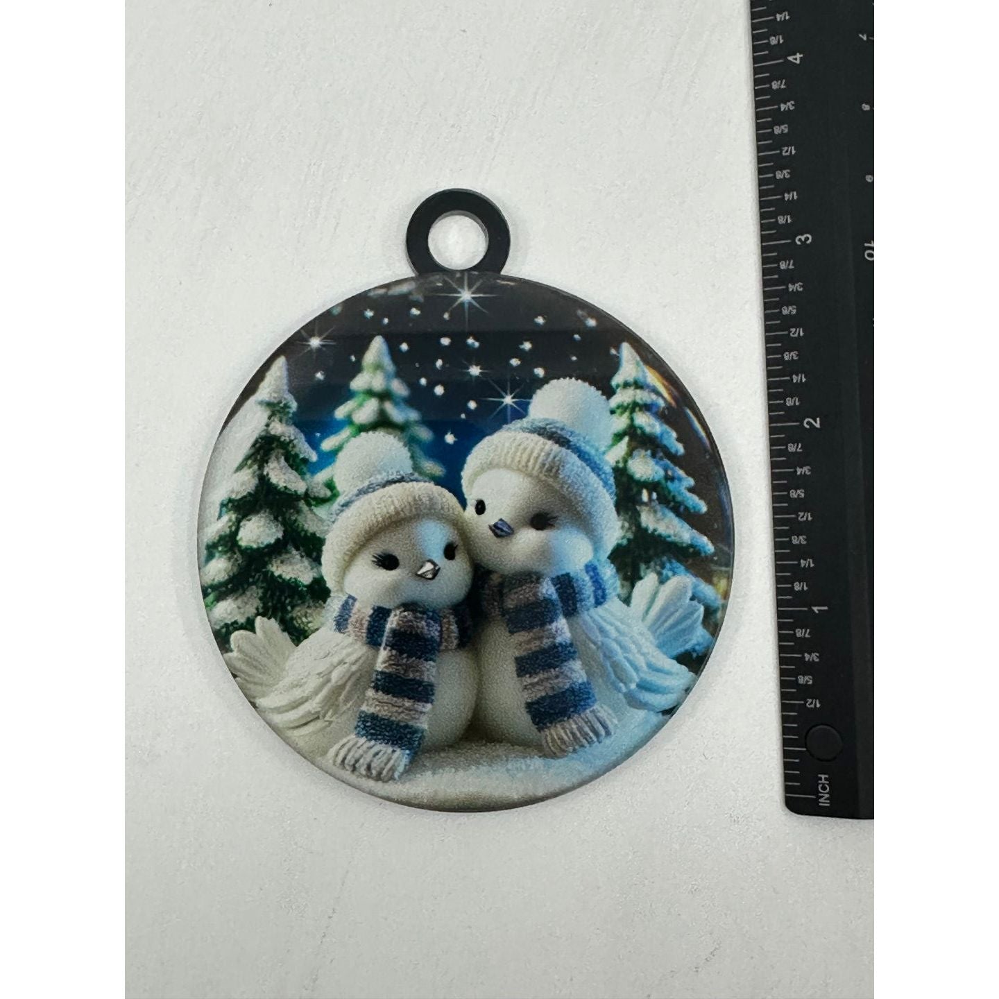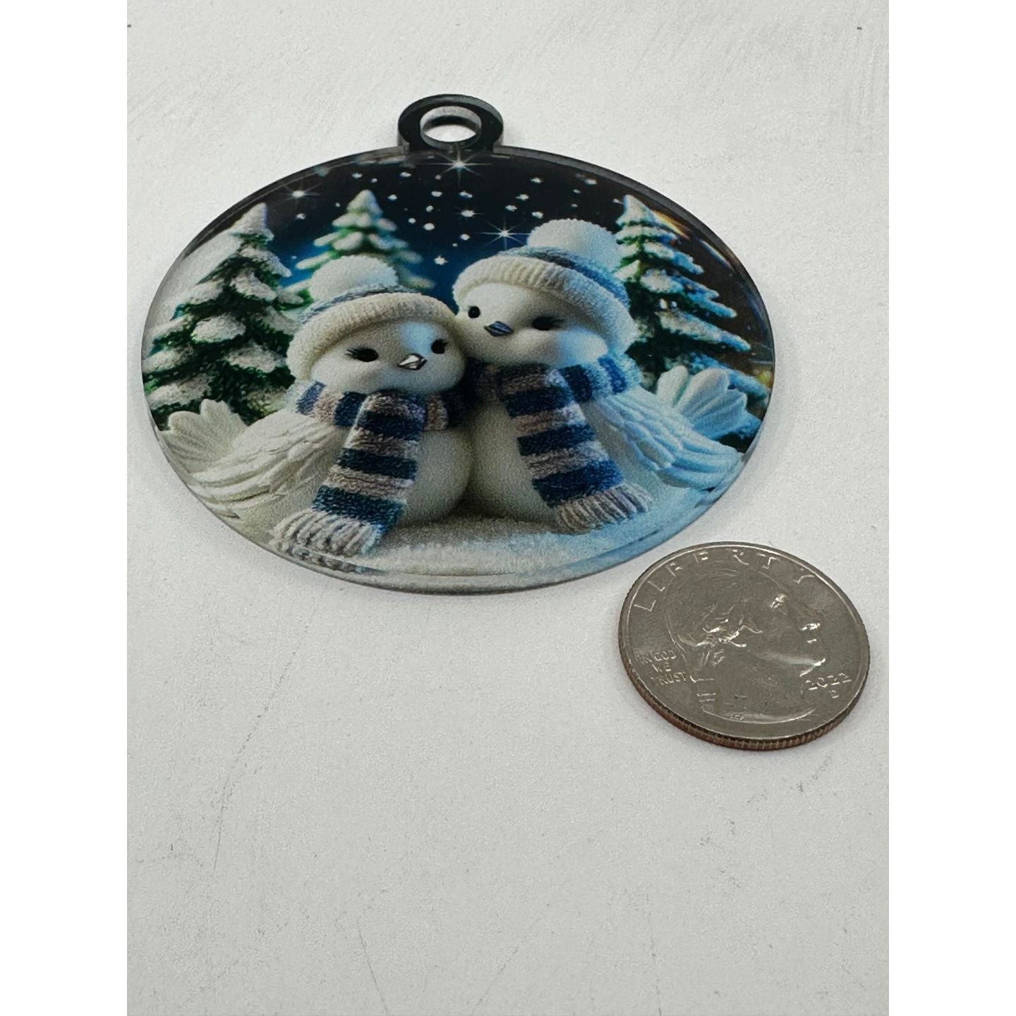 High-Quality Acrylic Design: The ornament is crafted with durable acrylic that features two cute winter birds bundled up in scarves, surrounded by snow-covered trees.